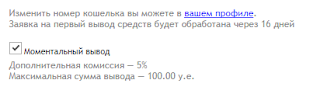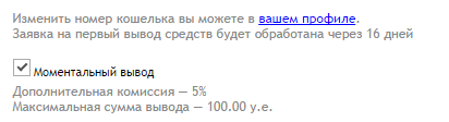 Если вы желаете получить ваши деньги сейчас, без каких либо ожиданий, тогда воспользуйтесь моментальным выводом. Внизу над вашими платежными реквизитами будет «Моментальный вывод». Нужно будет просто поставить галочку. Деньги поступят на счет в течение одной минуты. Такая услуга дополнительно взымает комиссию в виде 5% от общей суммы.