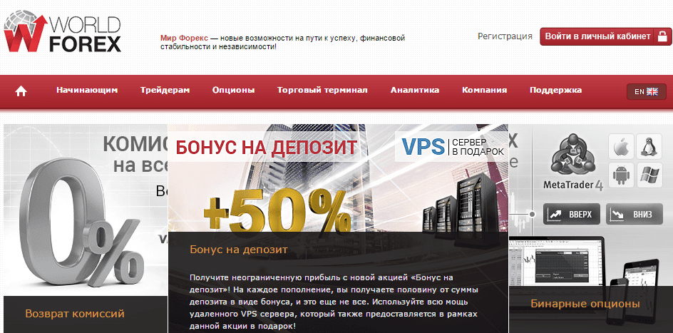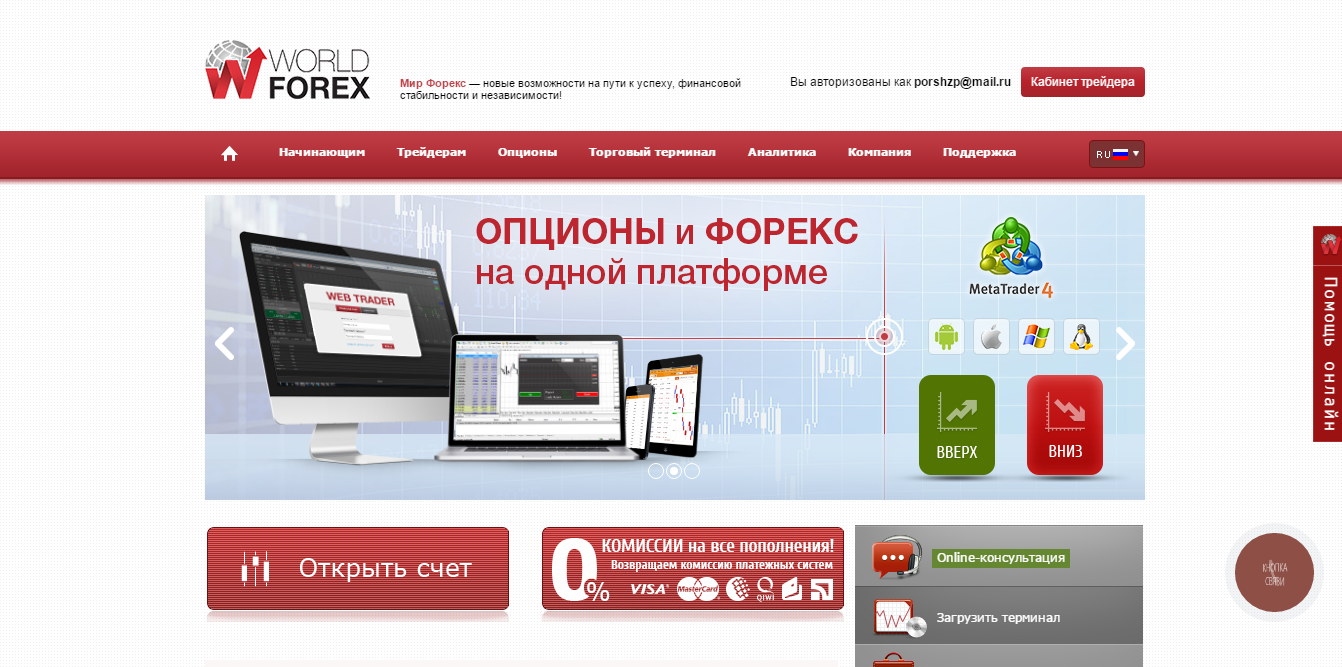 World Forex – брокер, который основал свою деятельность в 2007 году. Бренд был зарегистрирован на Британских Виргинских Островах. Компания имеет все необходимые лицензии для торговли, а ее деятельность контролирует VFSC (комиссия по надзору за рынком услуг).В 2016 году торговый бренд World Forex после продолжительных переговоров, был передан под управление компании Existrade Limited. ПРЕДОСТАВЛЯЕМЫЕ ВОЗМОЖНОСТИ ДЛЯ ТРЕЙДЕРОВ Счет Option – предоставляет трейдеру производить операции с бинарными опционами. Клиент, приобретая данный контракт, должен лишь определить падение или возрастания опциона, сделать ставку с заранее обозначенными рисками. В случаи неудачи, трейдер рискует лишь уже вложенными средствами, никаких других убытков не будет. Все опционы являются очень простыми, их можно просчитывать и выстроить свою уникальную стратегию. Каждая сделка заканчивается экспирацией, минимальное время закрытие сделки 1 мин. Платформа WebTrader – позволяет не только производить покупки опционов, но и вести их контроль, анализировать рыночную обстановку. Каждую открытую рыночную позицию всегда можно проанализировать и сделать соответствующие выводы. Для удобства вычислений были введены вспомогательные технологии осцилляторы и трендовые индикаторы. Сделки на MetaTrader 4 – программа, которую необходимо устанавливать на персональный компьютер. Она дает самую полную картину об опционах и анализе рынка. Форекс опцион 0-100 – самый новый вид бинарных опций. Он предоставляется эксклюзивно компанией World Forex и только для своих трейдеров. Что же тут нового? Во-первых, все сделки совершаются только со 100% исходом, прибыль и убытки будут только с таким процентным коэффициентом. Все операции покупки совершаются на одной платформе World Forex Trade Sattion (МТ4), что позволяет, обходится без дополнительных установок поддерживающих программ. Каждый спред подсчитывается, а после запятой котируются 4/2 знака. Все торговые приказы обрабатываются по запросу Instant Execution. ПОЧЕМУ СТОИТ НАЧАТЬ ТОРГОВАТЬ НА WORLD FOREX Опыт компании выстраивался многие годы. Каждый трейдер получает доступ к рынку Forex из любой точки мира. С 2007 года бренд заслужил признание в мировом масштабе, что привело в 2015 году к награде – лучший Форекс-брокер. Жюри MasterForex-V Expo было проанализировано компанию по 23 критериям, но по всем пунктам все было в порядке. Старт с минимальным депозитом Работать на мини-форекс можно со старта в 1 USD. Это самые маленькие вложения для заработка реально прибыльных капиталов. Риски минимальные и заранее спрогнозированы. Счет в валюте Стандартные счета открываются в долларах США, но нами предлагается взносы в национальных валютах, таких как RUR и UAH. Тем, кто уже давно торгует, считает себя действительно профессиональным игроком, становится доступна модель ECN/STP. Круглосуточная связь с торговыми площадками Современные сделки совершаются через сеть интернета полностью автоматически, каждая торговая площадка анализируется, а ставки на опции делаются 24 часа в сутки, начиная с понедельника и заканчивая пятницей включительно, выходные дни не обрабатываются. Все это можно проделывать прямиком с вашего браузера с WebTrader, без установки приложений. Обучение трейдеров на бесплатной основе Компания World Forex предоставляет совершенно бесплатную торговую площадку, демонстрационный счет позволяет получать навыки в
